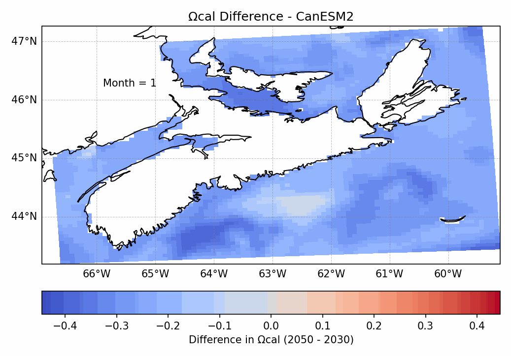 These animation shows the monthly difference in calcite saturation state (Ωcal) between two reference periods: 2030-2035 and 2050-2054 averages. The outputs are based on simulations from a regional biogeochemical ocean model for the Atlantic Canada region, forced with atmospheric outputs from three global climate models (CanESM2, MPI, and HadGEM2) under the RCP 8.5 emissions scenario. Each frame represents a single month of the year. Calcite saturation state is an indicator of carbonate chemistry conditions relevant to calcite-forming organisms. Decreases in Ωcal suggest increasing ocean acidification and reduced conditions for calcification.