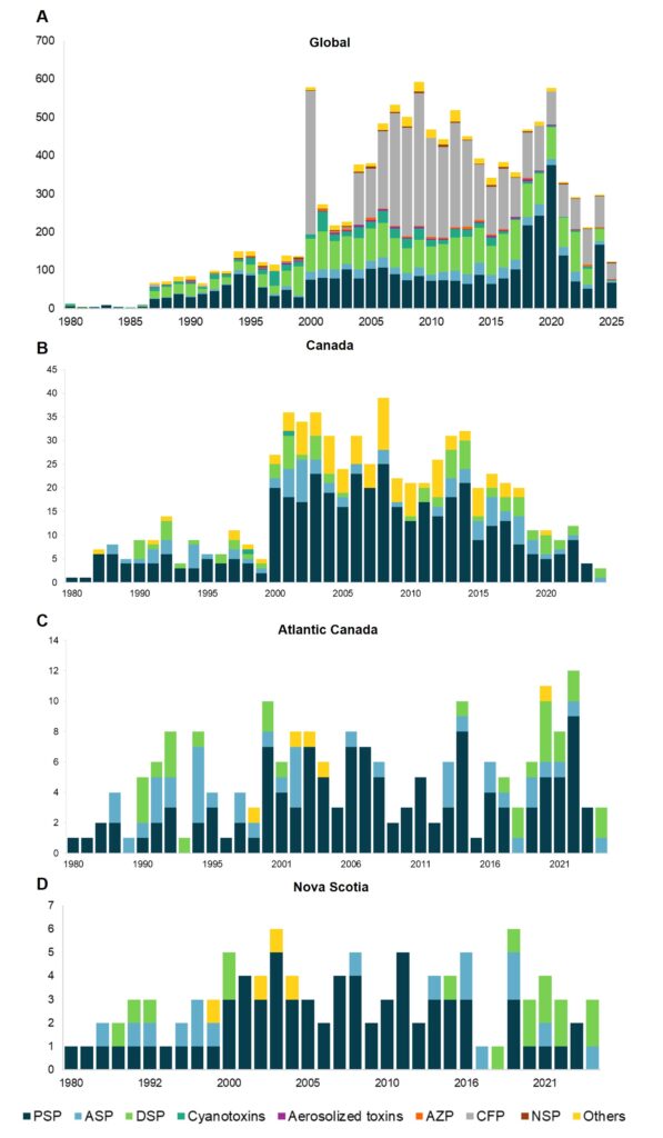 The figure below depicts the last 45 years of toxic HAB events by syndrome type, from global to Nova Scotia waters. Syndromes can be contracted through direct contact, ingestion of contaminated seafood or inhalation of aerosolized toxins. The effects vary from dermatological to neurological in humans and animals. Diarrhea and vomiting are the most common symptoms, but severe cases can be fatal.
