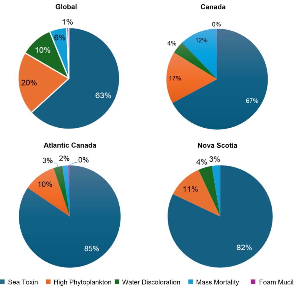 HABs can affect the marine environment and aquaculture through toxin production, oxygen depletion, or even achieving high-density levels that can clog an animal’s respiratory system. The figures below show shows a comparison of HABs events from a global to regional perspective, indicated by type.
