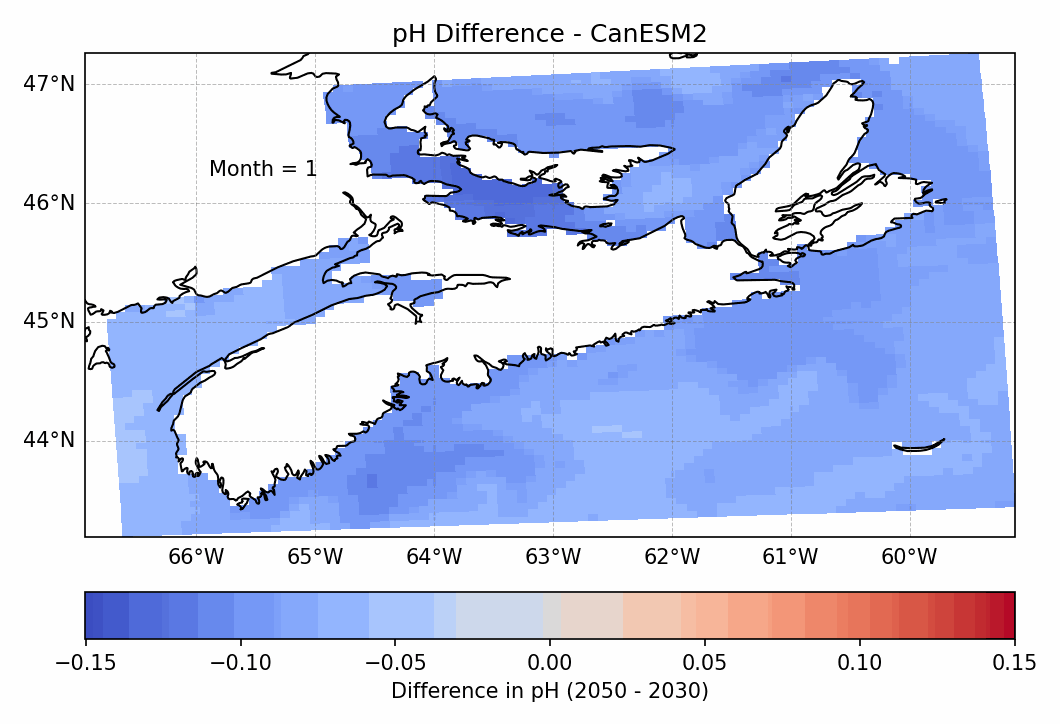 These animations show the monthly difference in surface seawater pH between two reference periods: 2030-2035 and 2050-2054 averages. The outputs are based on simulations from a regional biogeochemical ocean model for the Atlantic Canada region, forced with atmospheric outputs from three global climate models (CanESM2, MPI, and HadGEM2) under the RCP 8.5 emissions scenario. Each frame represents a single month of the year. Seawater pH is a measure of acidity, with lower values indicating more acidic conditions. Decreases in pH are associated with ocean acidification and can negatively affect marine organisms, particularly shell-forming species.