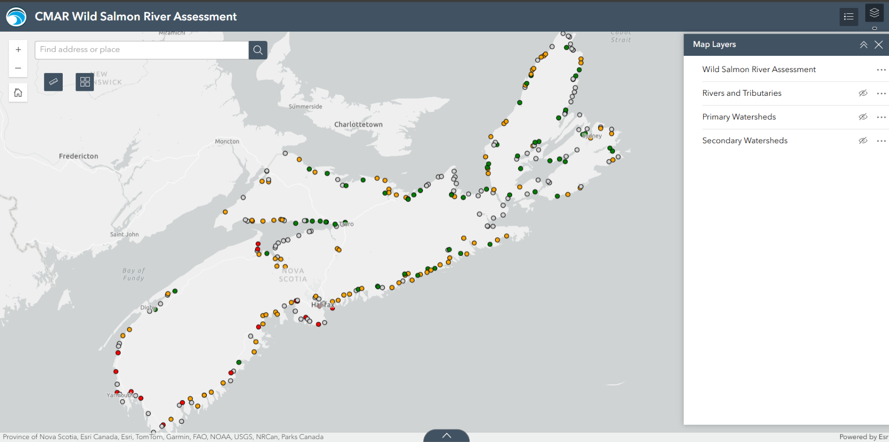 CMAR has assessed the significance of rivers for supporting the sustainability and conservation of wild salmon by compiling data from over 200 Nova Scotia rivers into a scoring framework. We gathered and incorporated various information across five criteria, including: a river’s habitat quality (e.g. temperature), population abundances, freshwater connectivity (e.g. barriers such as dams), existing stressors, as well as information on its importance for conservation.