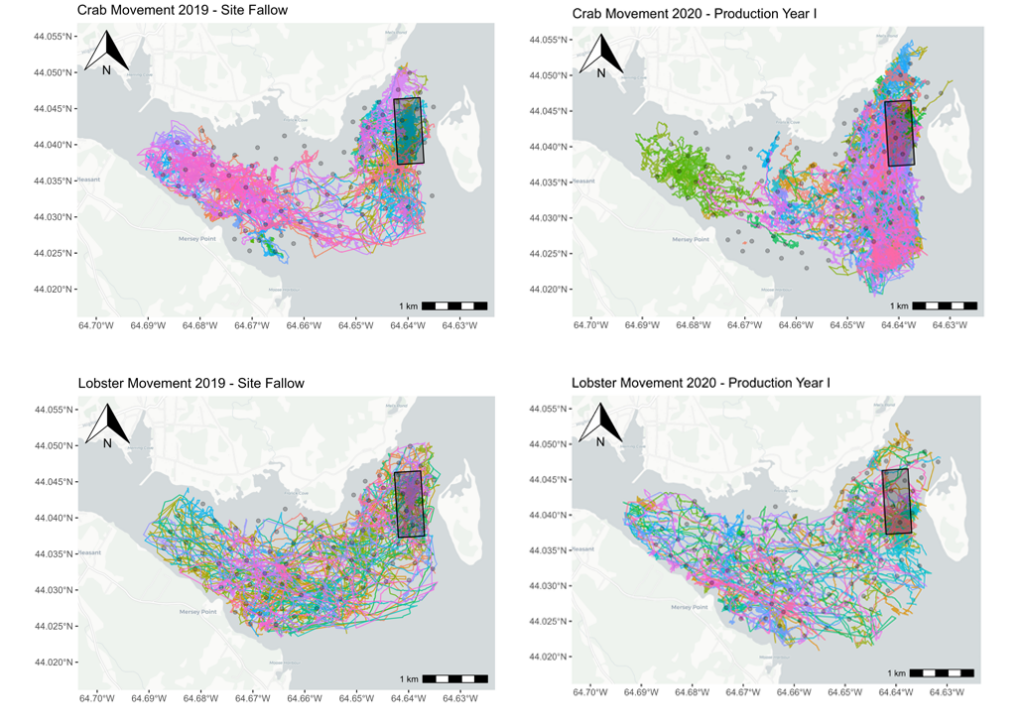 In collaboration with with CMAR and the Nova Scotia Department of Fisheries and Aquaculture (NSDFA), Fisheries and Oceans Canada (DFO) initiated an acoustical telemetry research project to better understand potential interactions between salmon aquaculture, lobster, and crab.